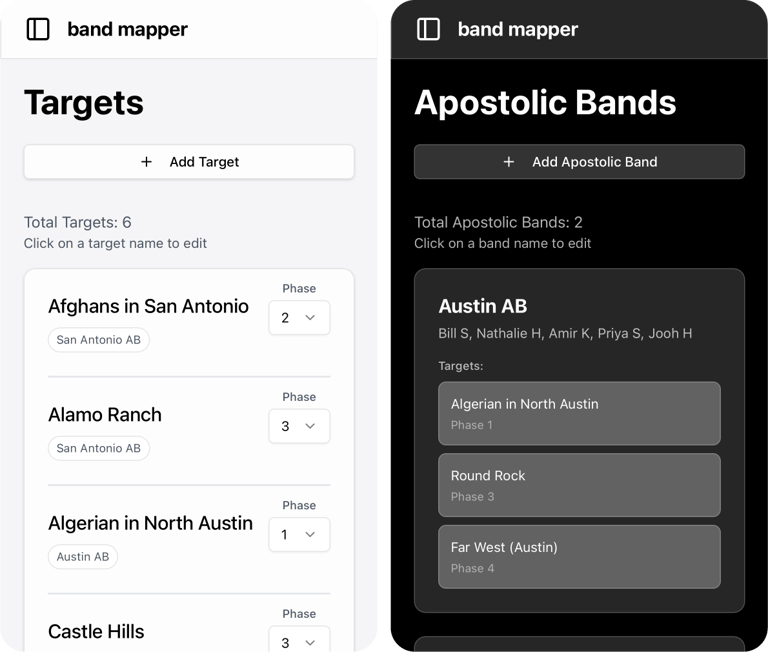 Maintain up-to-date lists for Apostolic Bands and their targets, helping you see relationships and activity at a glance.
